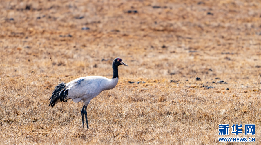 在香格里拉国家公园候选区内悠闲踱步的黑颈鹤(1月16日摄)。新华网发(香格里拉国家公园候选区 供图)