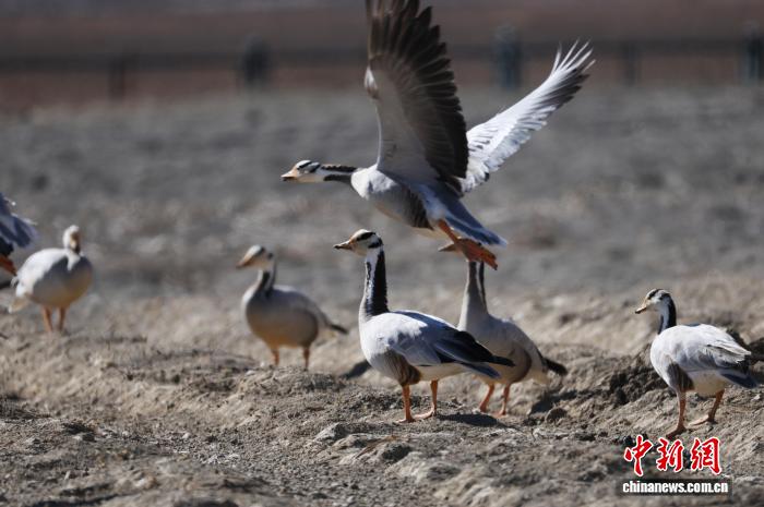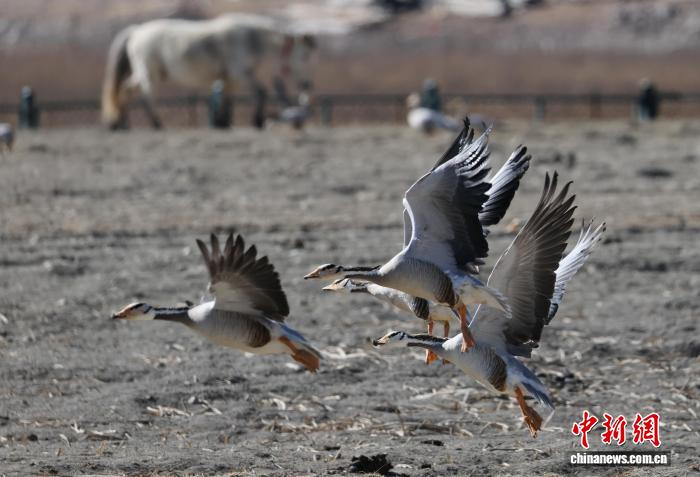 1月22日,一群斑头雁在纳帕海嬉戏。中新社记者 黄兴鸿 摄