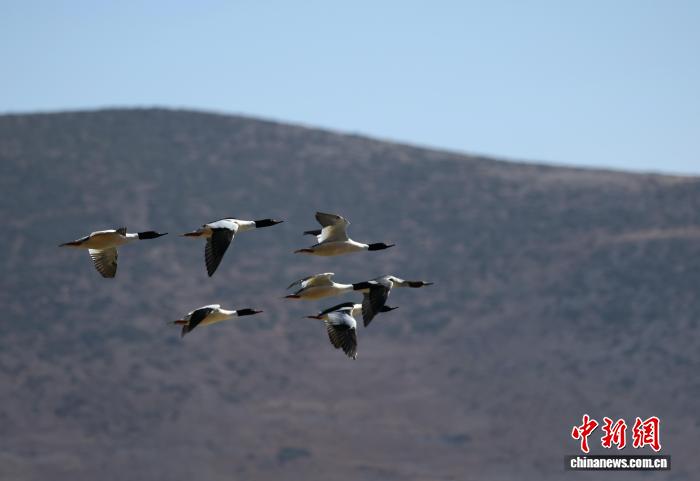 1月22日,一群秋沙鸭在空中飞翔。中新社记者 黄兴鸿 摄