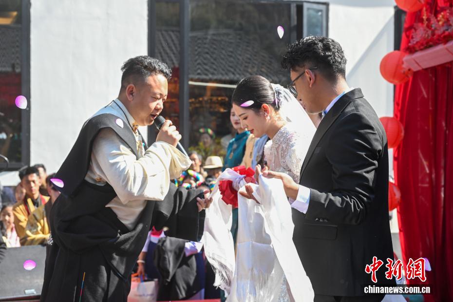 图为司仪为新人献上哈达表示祝福。中新社记者 李嘉娴 摄