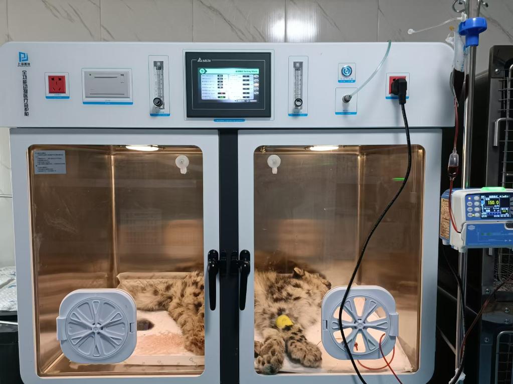雪豹“凌小蛰”在恒温氧舱中接受治疗。