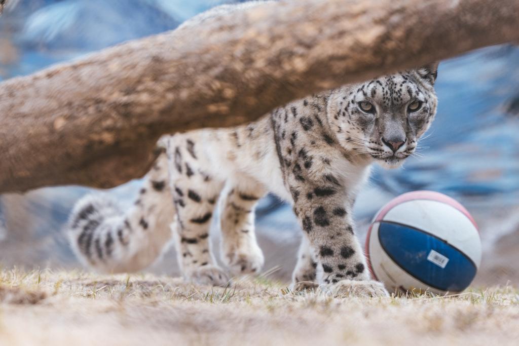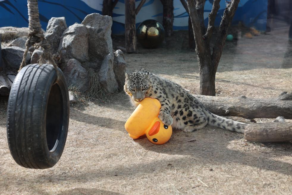 雪豹“凌小蛰”在雪豹馆内和“大黄鸭”玩具玩耍。