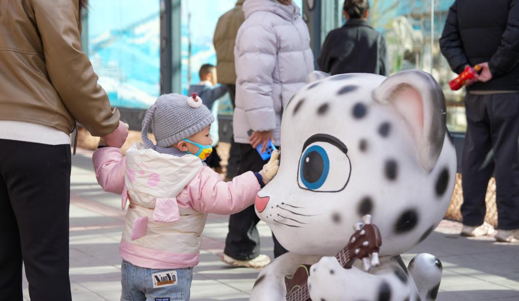 在西宁野生动物园,小朋友和雪豹玩偶互动。