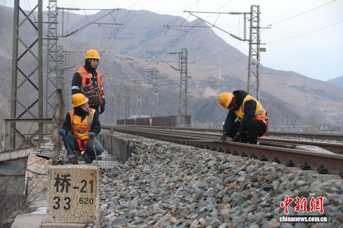 2月2日,在青海省西宁市湟源县新民村湟水河特大桥上,中国铁路青藏集团有限公司西宁工务段的桥隧工正巡检。中新社记者 张忠苹 摄