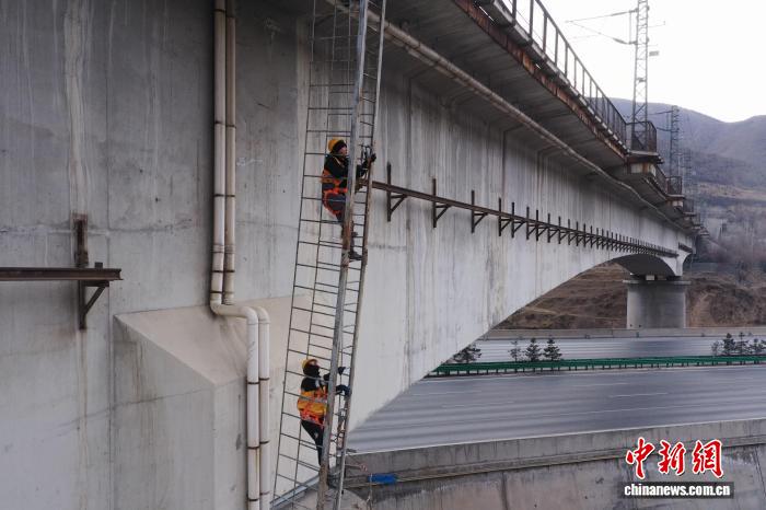 2月2日,在青海省西宁市湟源县新民村湟水河特大桥上,中国铁路青藏集团有限公司西宁工务段的桥隧工攀爬铁梯,检查桥墩安全。(无人机照片)中新社记者 张忠苹 摄