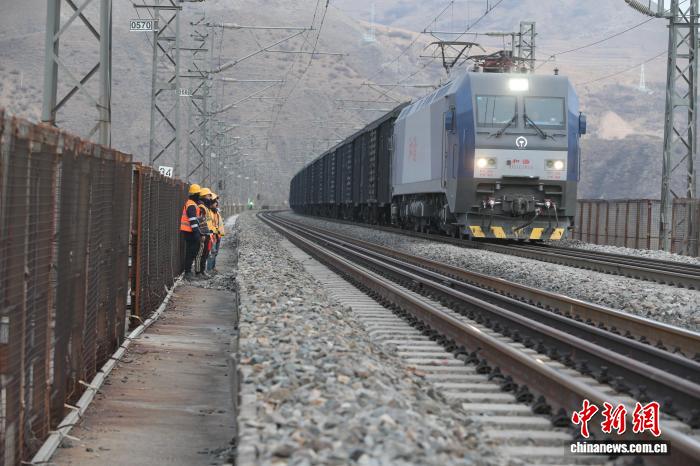 2月2日,在青海省西宁市湟源县新民村湟水河特大桥上,中国铁路青藏集团有限公司西宁工务段的桥隧工正避让上行列车。中新社记者 张忠苹 摄