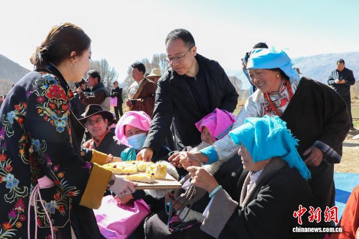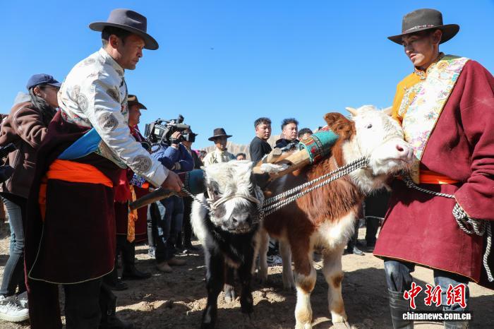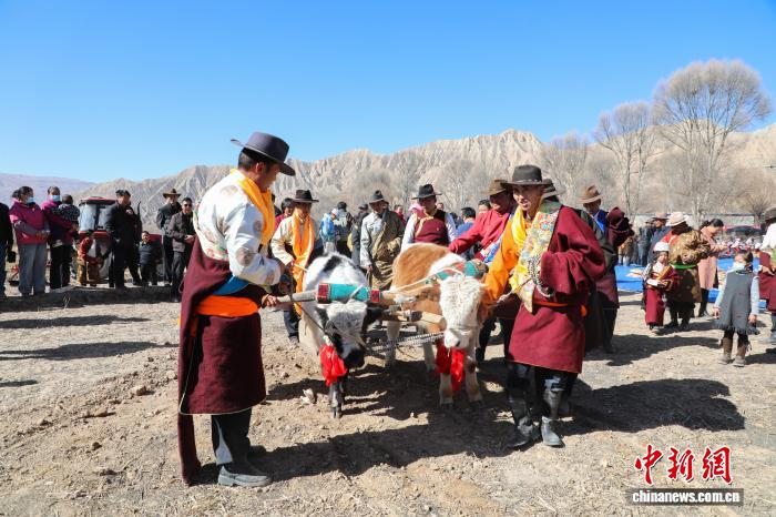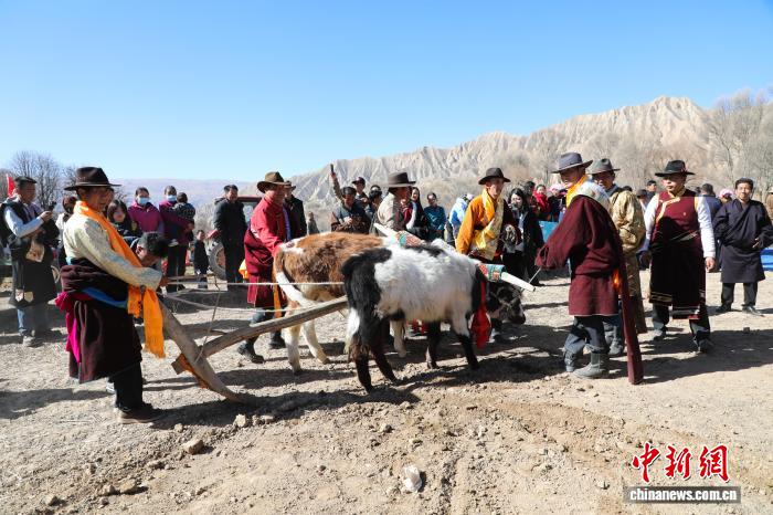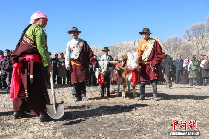 3月10日,青海省海南藏族自治州贵德县,民众身穿节日盛装,手捧春耕馍馍(藏语称之为“彤糕”)来到田间,以“二牛抬杠”的传统方式开启春耕“第一犁”,寄托对国泰民安、风调雨顺、五谷丰登的美好期望。