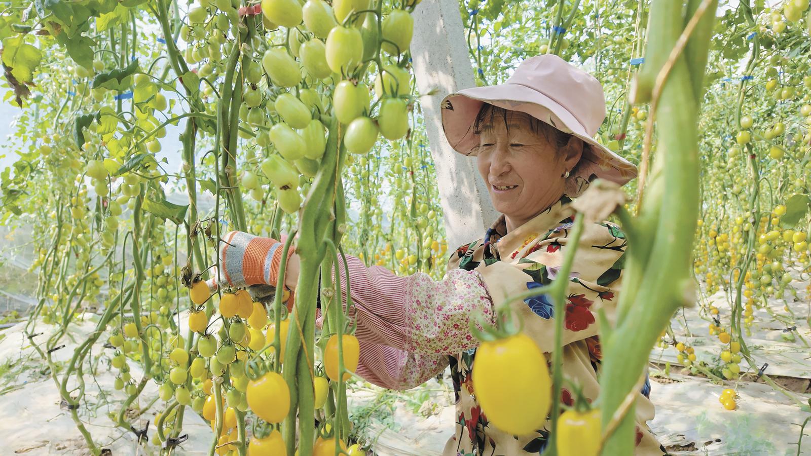 村民采摘成熟的圣女果。顾植霞 摄