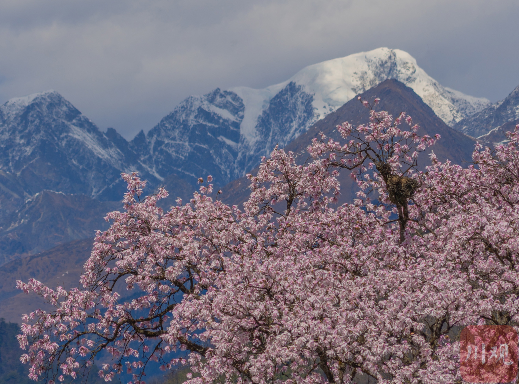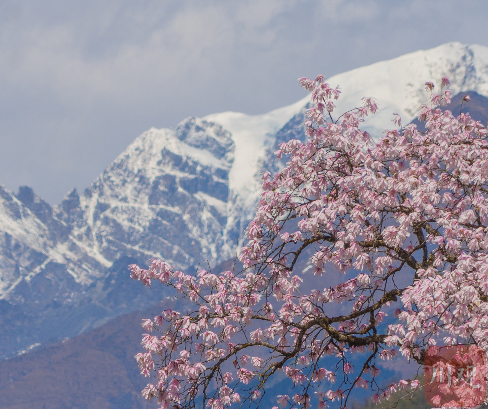盛开的木兰花与雪山同框