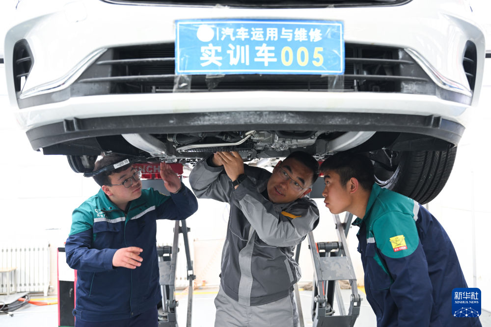 3月30日,在青海省海北藏族自治州职业技术学校,山东援青教师曹强(中)在指导学生实操。新华社记者 张龙 摄