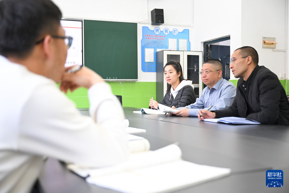 3月31日,在青海省海北藏族自治州门源回族自治县浩门镇高级中学,山东援青教师徐春瑶(右三)、王程(右二)在开展教研活动。新华社记者 张龙 摄