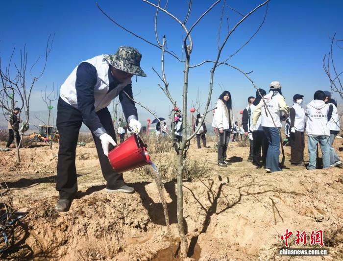 图为参与者为新栽植的树苗浇水。祁增蓓摄
