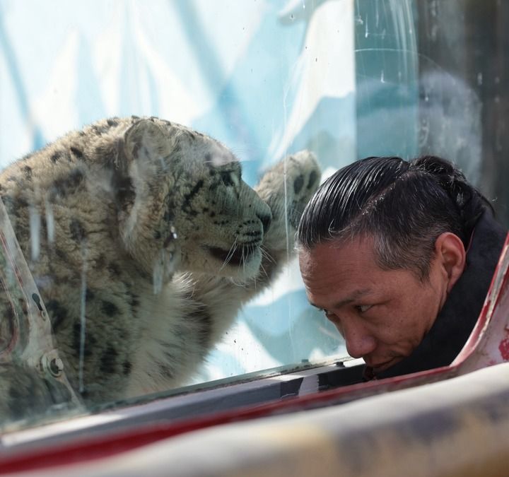 雪豹“凌小蛰”在雪豹馆和兽医赵海龙隔窗互动。新华每日电讯记者 李宁 摄