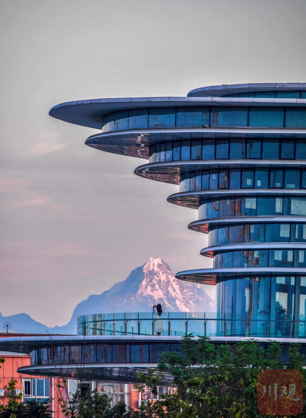 市民在成都市双流区空港云的建筑上眺望幺妹峰。何海洋 摄