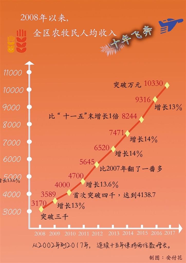 1月24日召开的自治区十一届人大一次会议传来喜讯,刚刚过去的2017年,西藏农村居民人均可支配收入突破万元,达到10330元,增长13.6%。这是在以习近平同志为核心的党中央亲切关怀下,全区上下勠力同心、砥砺奋进,创造的又一项经济指标新高,是全区各族群众用辛勤的汗水和勤劳的双手为幸福生活挣来的又一个“大礼包”。