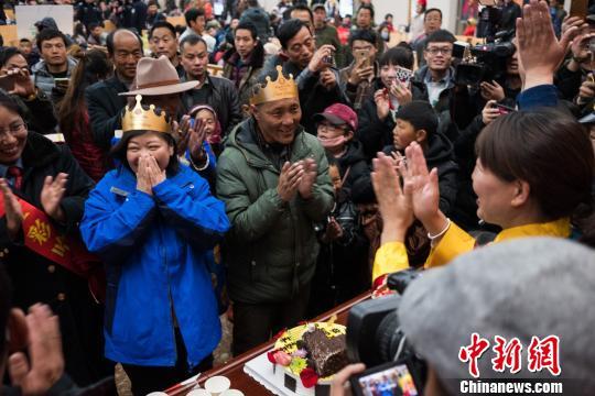 2月1日,拉萨火车站在候车室为两名旅客庆祝生日。 何蓬磊 摄