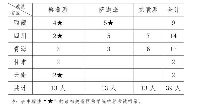 (一)格鲁派计划在西藏招收4人,四川招收2人,青海招收3人,甘肃招收2人,云南招收2人。