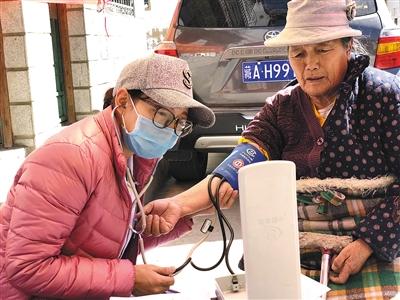 拉萨市城关区籍居民家庭医生签约率达90%,目前,常住人口家庭医生签约工作正在稳步推进中,只要在拉萨居住满6个月的常住人口,就能够与当地居民一样享受到13项基本公共卫生服务项目和医疗服务。图为扎细社区卫生服务中心家庭医生团队正在为辖区常住人口测量血压。记者 央金 摄