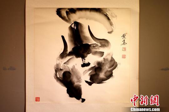 西藏画家孟繁华创新使用水墨写意的方式进行牦牛画创作。图为他所绘的野牦牛水墨画。 江飞波 摄