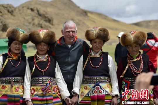 图为外国越野跑爱好者在西藏山南与当地藏族民众合影。 周文元 摄