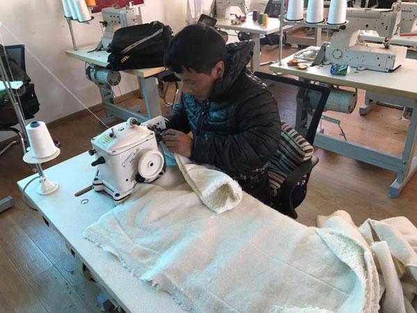 图为八宿县民族工艺服饰加工厂员工正在加工服装。