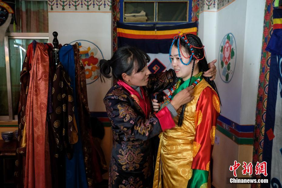 游客们在德吉家中体验藏装。文/何蓬磊 张伟 图/何蓬磊