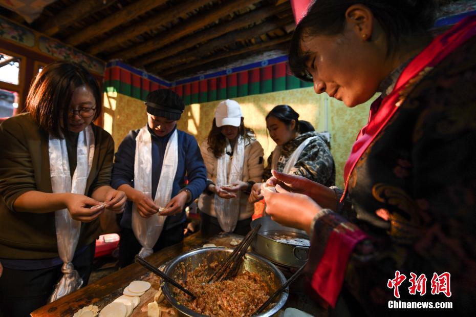 游客们在德吉家中包饺子,迎接藏历新年。文/何蓬磊 张伟 图/何蓬磊