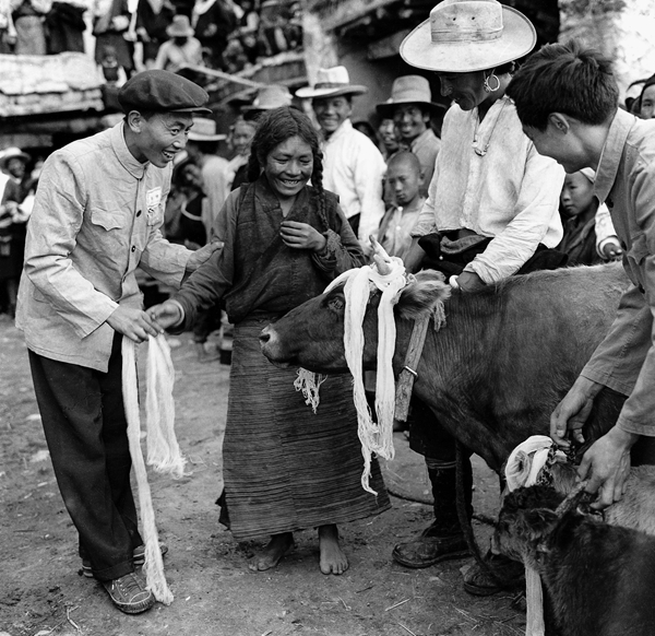 1959年以后,陈宗烈摄影作品的画风发生了转变,镜头里出现了翻身得解放的农奴焚烧债券契约、分得土地和牲畜的农民难掩心中喜悦、坐在驾驶舱里意气风发的西藏第一位拖拉机手……那一年,西藏民主改革震惊世界,沿袭了1000多年的农奴制度终于废除了。