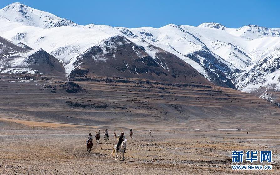村民在西藏那曲市尼玛县当穹错旁骑马飞驰(4月30日摄)。新华社记者 侯捷 摄