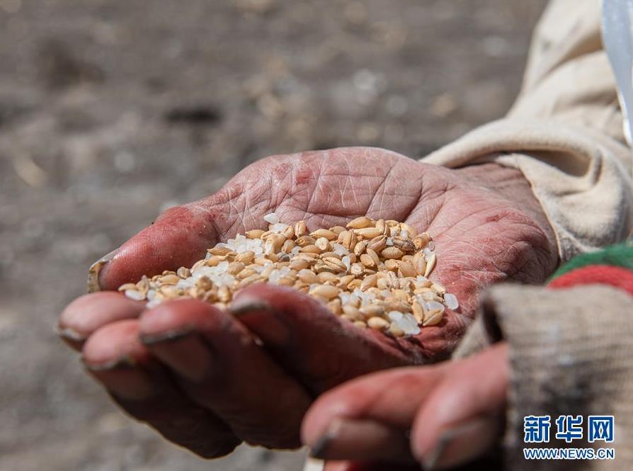 这是4月30日在西藏那曲市尼玛县当穹错旁举行的春耕典礼上拍摄的曲旺老人手中的青稞良种。新华社记者 侯捷 摄