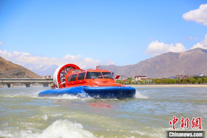 图为救援人员驾驶水陆两栖气垫船加速向孤岛被困人员开进。拉萨市消防救援支队 供图