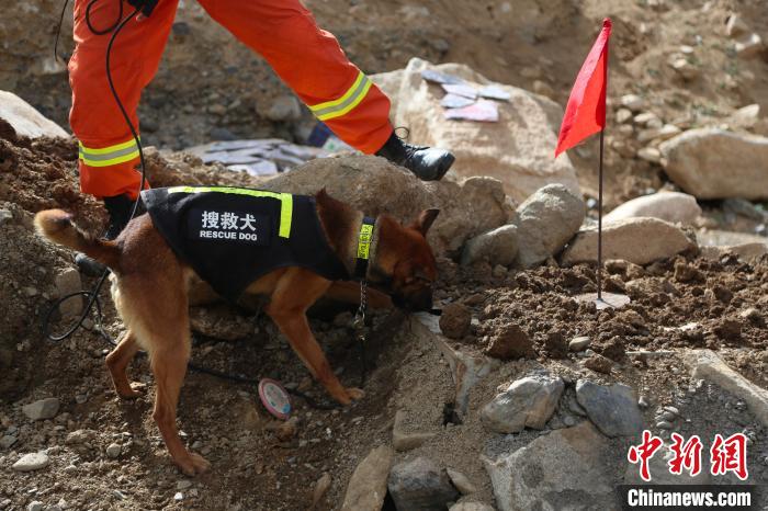 图为救援人员带搜救犬搜救泥石流灾害区域被困人员。拉萨市消防救援支队 供图