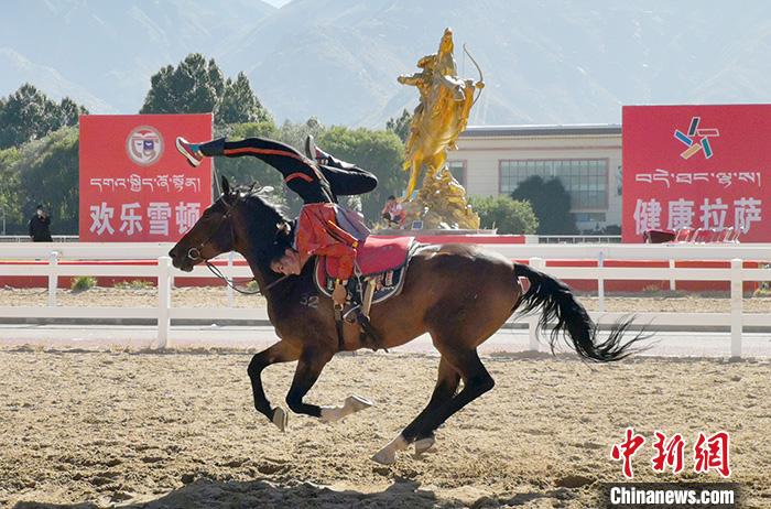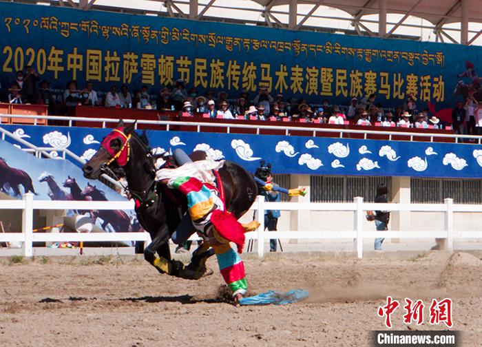 8月20日,2020年中国拉萨雪顿节民族传统马术表演暨民族赛马比赛活动在西藏自治区拉萨市举行。图为女子马术运动员进行民族传统马术分腿倒立表演。 中新社记者 张伟 摄