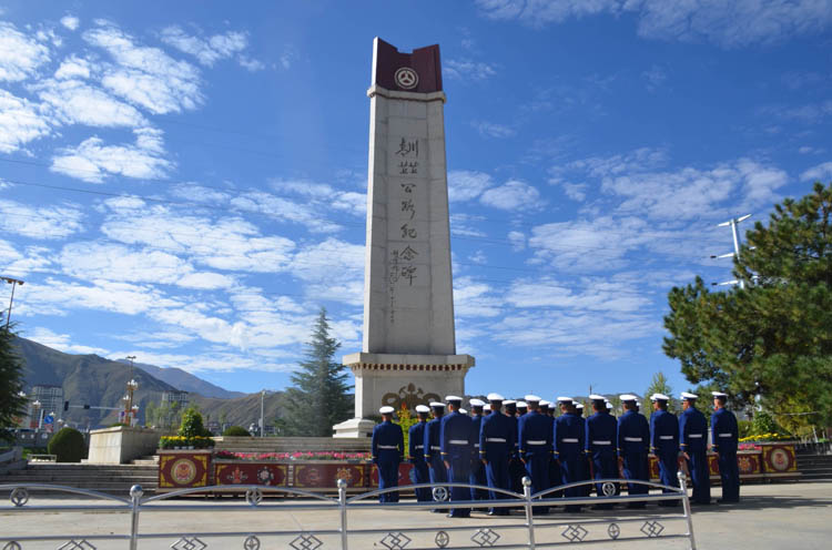 图为西藏森林消防总队特勤大队在青藏川藏公路纪念碑前缅怀先烈。