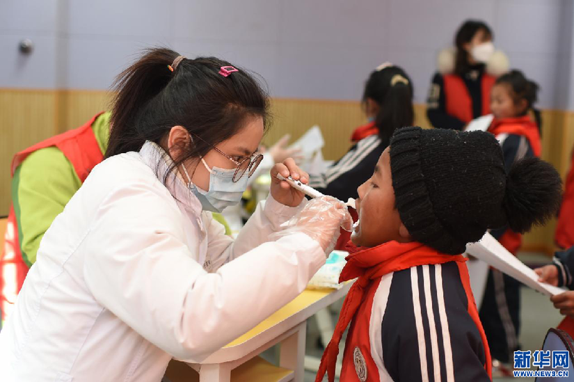 12月17日,来自青苗儿童口腔的医生为学生进行口腔健康检测。新华网 旦增努布 摄