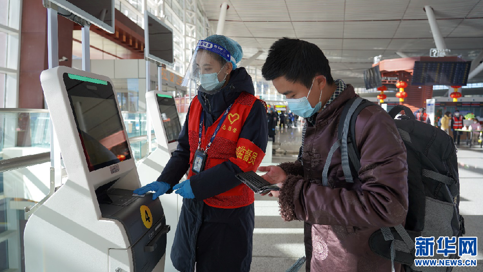 1月17日,志愿者协助旅客办理电子乘机手续。新华网 达珍 摄