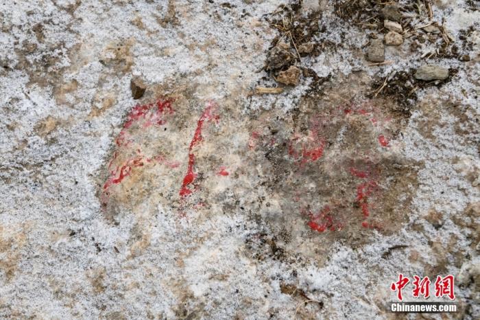 图为1月19日拍摄的西藏拉萨市堆龙德庆区德庆乡邱桑村邱桑温泉石灰岩上的“古人类手脚印”。中新社记者 贡嘎来松 摄