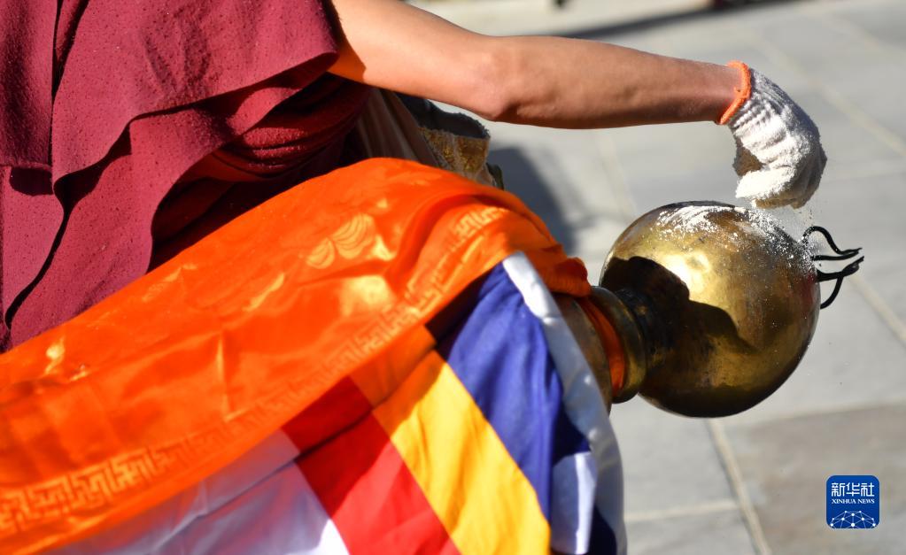3月7日,立经杆仪式结束后,僧人向天空抛撒糌粑,祈愿风调雨顺。新华社记者 觉果 摄