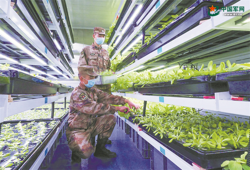 官兵在“植物工厂”采摘蔬菜。李海亮摄