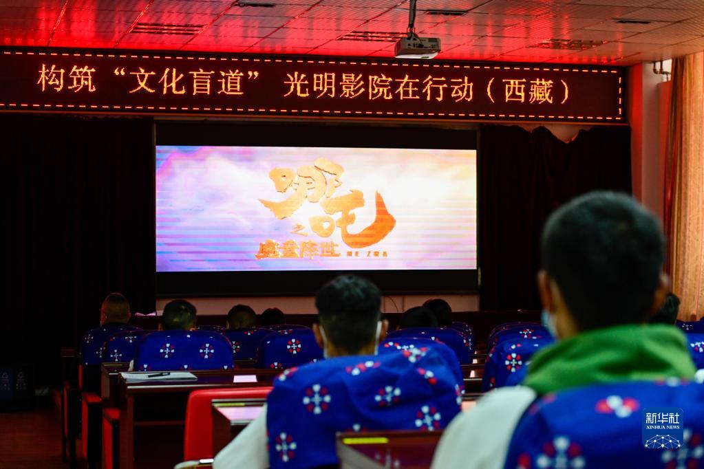 银幕上,电影《哪吒之魔童降世》正在放映,旁白伴随画面的切换,将故事娓娓道来。台下,拉萨市特殊教育学校的学生们认真聆听,沉浸在跌宕起伏的剧情中……