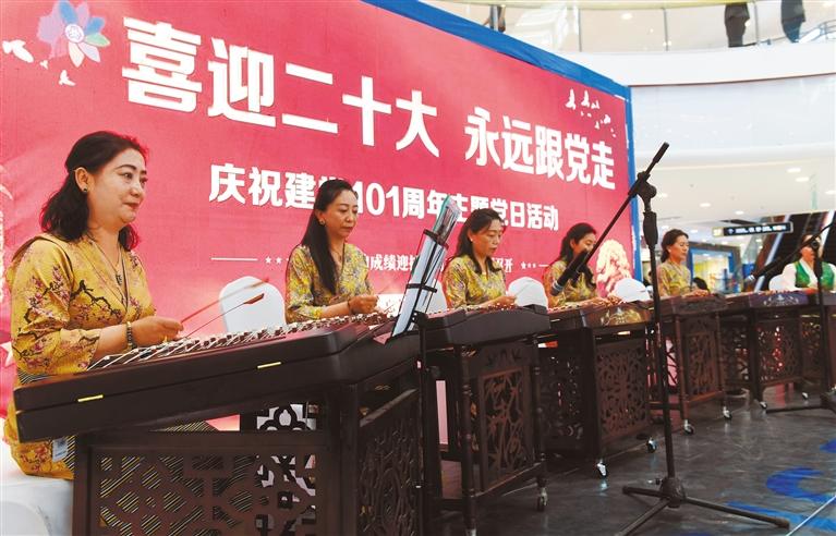 图为西藏自治区妇联联合西藏萌升老年大学在拉萨市城关万达广场举办“喜迎二十大 永远跟党走”主题党日活动。这是萌升老年大学的学生在演奏扬琴。记者 旦增兰泽 摄