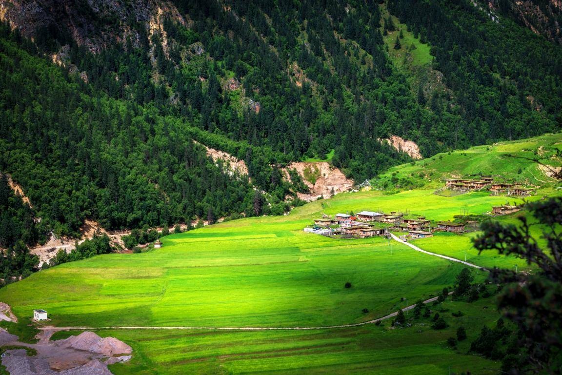 河流在绿油油的丛林中绘制出一条条宝石蓝玉带,在阳光的照射下,波光粼粼。远处,小桥流水,极具藏族特色的民居掩映其中。