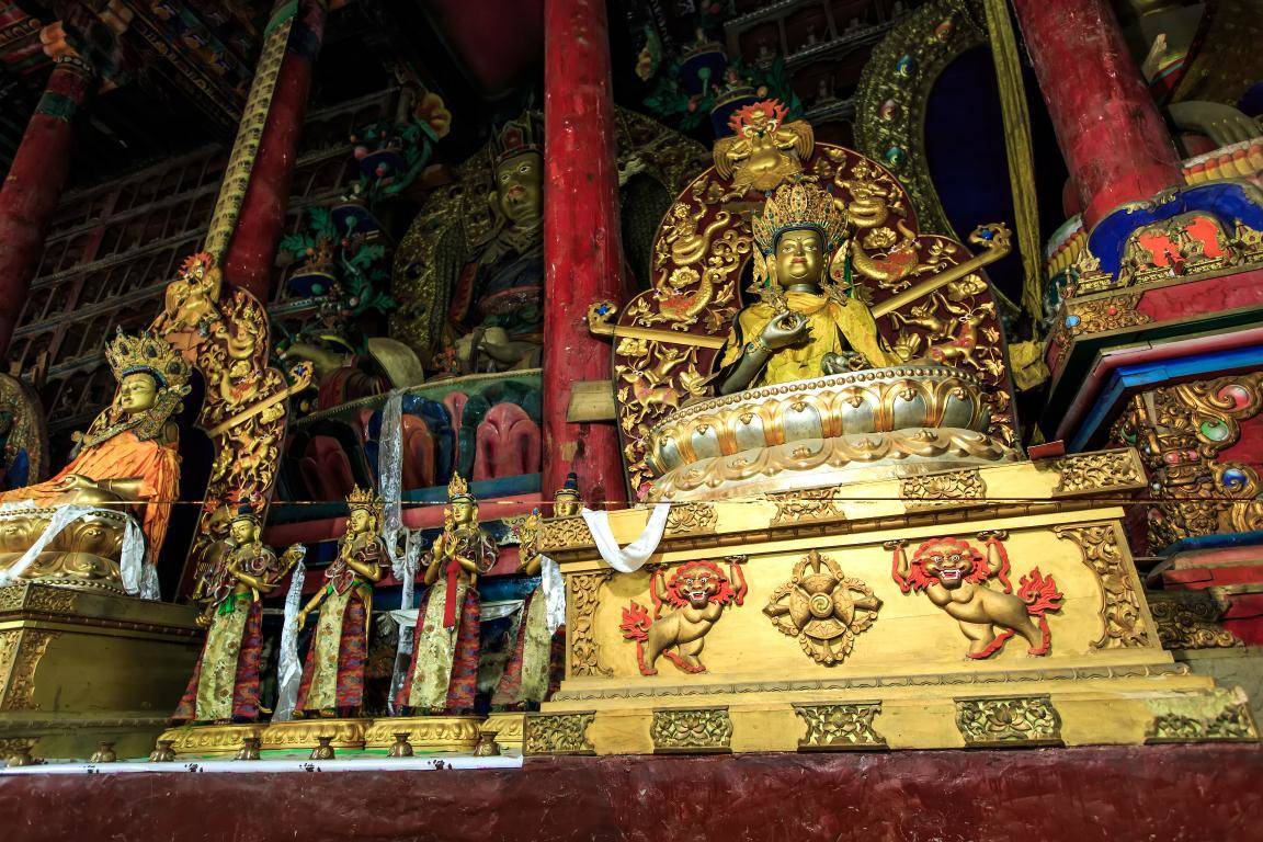 其中的查杰玛大殿收藏文物丰富,珍藏有传说中的格萨尔王的九龙镀金马鞍、格萨尔王部下的宝刀、八瓣莲花的时轮金刚像、明清时期的唐卡、达垅塘巴·扎希贝的银质佛像及不同时期的金、银、铜各类佛像及经版等文物。
