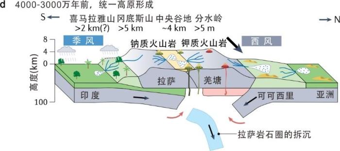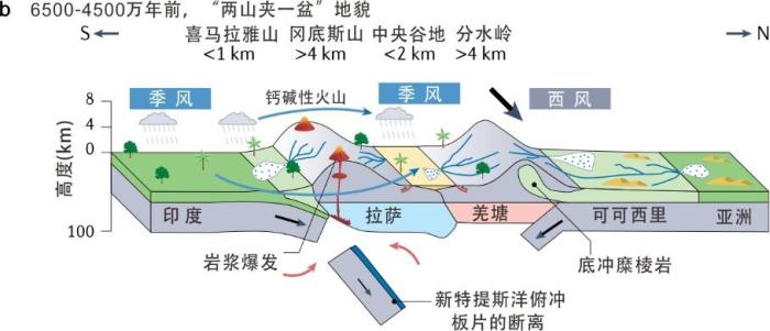 5500万-4500万年前,由于新特提斯洋俯冲板片的断离,冈底斯造山带隆升到4500米高海拔。