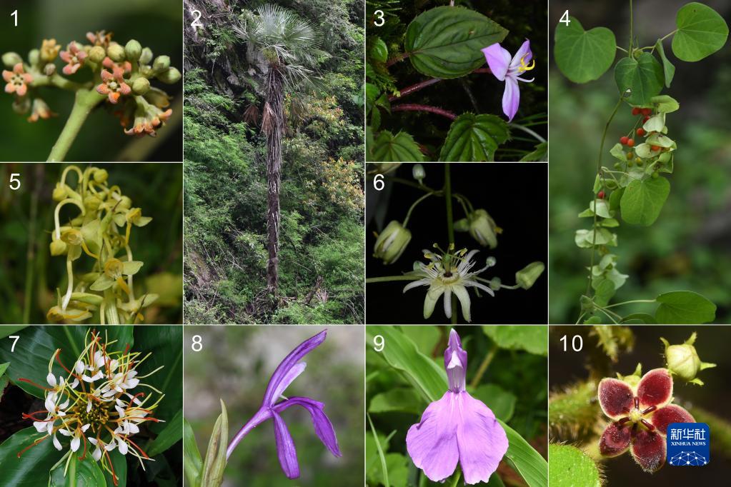 图为:1、吉隆牛奶菜;2、塔基棕榈;3、喀西蜂斗草;4、旋花锡生藤;5、吉隆角盘兰;6、尼泊尔西番莲;7、椭穗姜花;8、藏南象牙参;9、象牙参;10、箭药藤(中国科学院西双版纳热带植物园供图)
