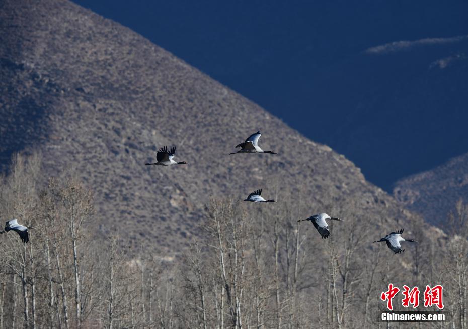 每年的10月底,成群的黑颈鹤飞到西藏拉萨市林周县越冬,在拉萨市林周县周边的湖泊湿地度过5个月的“闲云野鹤”生活,次年三四月份再飞向藏北草原繁殖。黑颈鹤是世界上唯一一种高原鹤类。具有足长、喙长、颈长的典型涉禽类特征,适合在沼泽地里行走。黑颈鹤的颈、尾为黑色,体羽为灰白色。黑颈鹤是国家一级保护动物。目前,每年到林周县越冬的黑颈鹤已达2000只左右。图为黑颈鹤在林周境内的农田上空飞翔。 贡嘎来松 摄