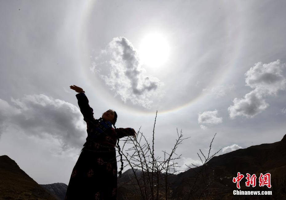 3月20日,西藏拉萨,身着藏装的游客与日晕相映。李林 摄