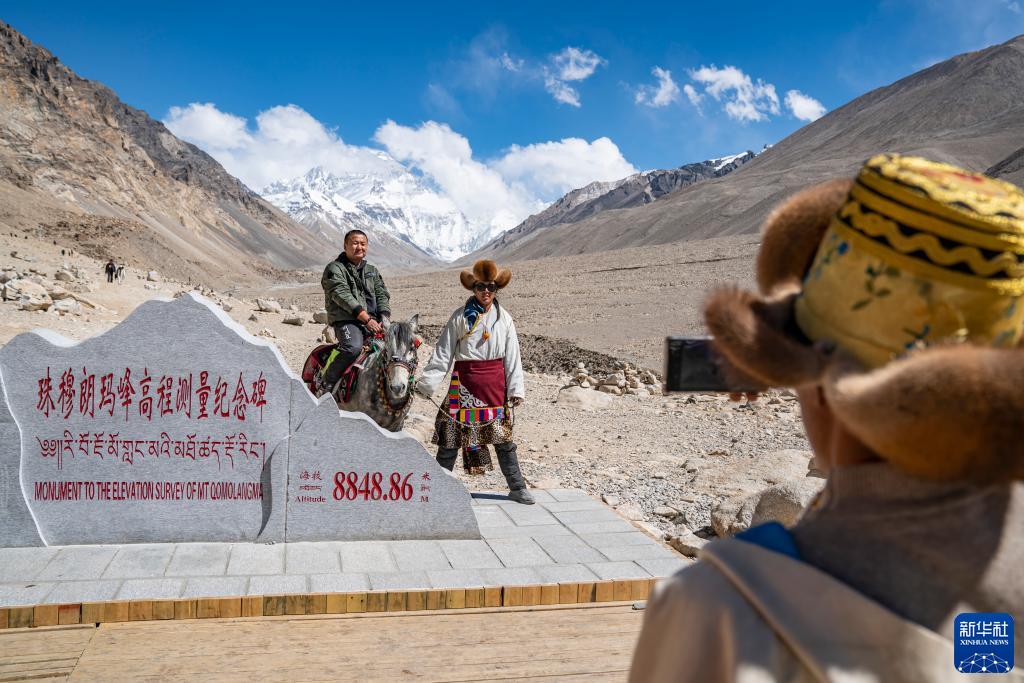 在珠峰大本营的珠峰高程测量纪念碑前,游客拍照留念(5月20日摄)。新华社记者 孙非 摄