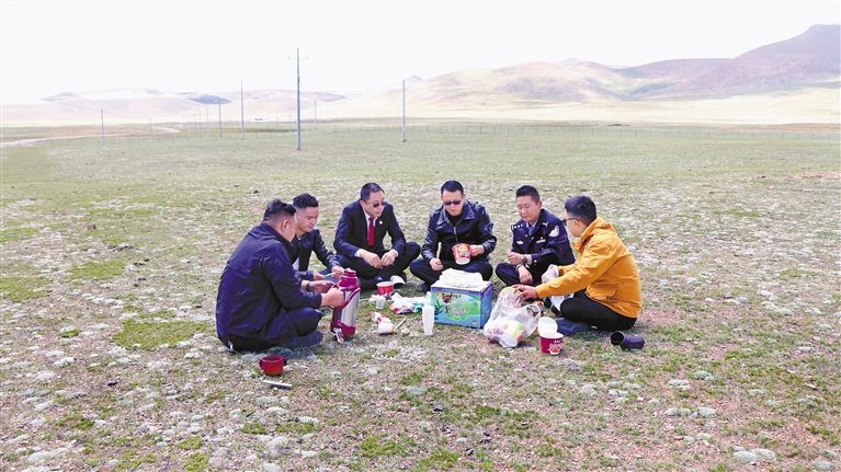 普玛江塘中心法庭干警下乡途中在野外就餐。