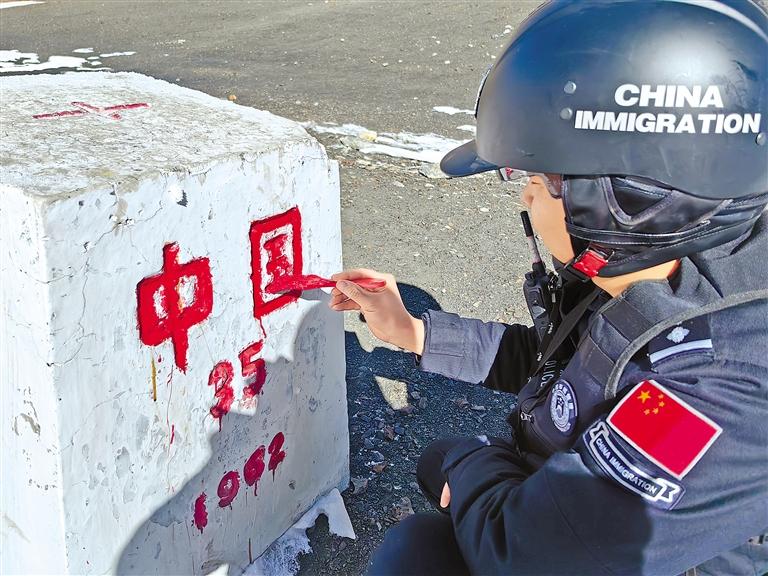 日喀则边境管理支队贡当边境派出所民警执行山口巡逻踏查任务,并为界碑描红。通讯员 林萧 摄